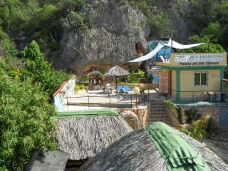 Paraiso del Mar - Siboney Unser kleines Resort liegt in exponierter Lage ruhig zwischen Küste (100m) und hochragenden Felsen. Zwei Gästezimmern befinden sich Erdgeschoss des Haupthauses, für die ein Wohnzimmer mit TV und Meerblick zur Benutzung bereitsteht. Zusätzlich bieten wir Ihnen ein freistehendes Ferienhäuschen mit großer Dachterrasse, fantastischem Meerblick und großem Sonnenschirm an. Zwei Ranchos im gemütlichen, großzügig Innenhof spenden Schatten und laden zu Mahlzeiten sowie jederzeit zum Entspannen ein. Die Unterkunft Unsere Anlage besteht aus einem zweistöckigen Haupthaus, einem kleinen Ferienhaus und zwei landestypischen Ranchos mit integrierter Bar. Das Außengelände ist mit Naturfelsen und Korallen angelegt und wird durch schöne Bepflanzung zur Geltung gebracht. Auf unserem Gelände stehen Ihnen zwei Duschen, eine Toilette, mehrere Aussichtsterrassen und Liegen zur Verfügung. Alle Gästezimmer erreichen Sie durch eigene Eingänge. Das gemeinsam nutzbare Wohnzimmer hat einen Ventilator, TV und Meerblick. Alle Zimmer sind mit Doppelbetten, Klimaanlage, Ventilator, Kühlschrank, Dusche und WC ausgestattet. Unser Haus ist 100 Meter von der Felsküste entfernt. Zum Strand und zur Wifi-zone sind es ca. 400 Meter. Hinter unserem Grundstück gibt es 25 Meter hohe Felsen mit Naturhöhlen die Sie auf einem eigenen Pfad besteigen können. Genießen Sie die herrliche Aussicht und wundervolle Sonnenuntergänge. Zugang für Gäste Unsere Gäste können alle Terrassen, den gesamten Außenbereich, das Gästewohnzimmer mit TV, die Küche bis 22:00 Uhr, die Liegen und alle Aussichtspunkte nutzen. Interaktion mit Gästen Wir (Gerd und Noris) wohnen im Haus und verstehen Sie in deutscher, englischer und spanischer Sprache. Wir unterstützen Sie gerne bei touristischen Fragestellungen und organisieren bei Bedarf individuelle Ausflüge, Taxifahrten oder erkunden auf Wunsch im eigenen Willy Jeep mit Ihnen Santiago und Umgebung. An unserer natürlichen Korallen Bar servieren wir leckere Cocktails – hier wurden schon so manche Reise- und Lebenserfahrungen ausgetauscht. Auf Vorbestellung bieten wir Ihnen ein exklusives internationales Dinner im Kerzenschein. Die Nachbarschaft Siboney ist ein kleiner ruhiger Ferienort der zu schönen Spaziergängen in der Umgebung und Wanderungen in den Bergen einlädt. Es gibt einige kleine Restaurants und zwei Geschäfte. Nach Santiago benötigt man ca.25 min. Verkehrsmittel Von unserem Haus zur Bushaltestelle sind es ca. 50m. Zum Strand und zu der Wifi-zone sind es 400 Meter. Sammeltaxis fahren von dort ebenfalls für ca.1 Dollar nach Santiago.