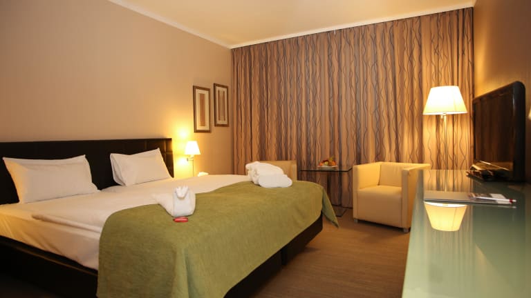 - 325 Zimmer und Studios - Frühstücksbuffet - Restaurant und Bar - Innen- und Außenpools (saisonal geöffnet) - Fitness, Sauna und Dampfbad - Solarium(*) und Massagen(*) - Kegeln(*) - Tischtennis und Tennisplatz - 14 Tagungs- und Seminarräume, multifunktional - Gratis Wifi - 480 kostenlose Parkplätze (*zahlbar)