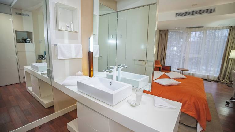 Die Zimmer sind modern und großzügig gestaltet. Sie sind ausgestattet mit Klimaanlage, Heizung, Ventilator und verfügen über ein Doppelbett oder Kingsize-Bett sowie Zustellbetten auf Anfrage. Weitere Annehmlichkeiten umfassen einen Safe, eine Minibar, einen Schreibtisch, einen Kühlschrank, eine Tee- und Kaffeemaschine, ein Telefon, einen Flachbild-TV und kostenloses WLAN. Zu den Badezimmern gehören Dusche und Haartrockner. Hausschuhe und Kosmetikartikel runden die Ausstattung ab.