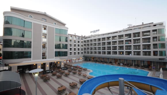 Das Pasa Beach Hotel in Marmaris ist der perfekte Ort für einen entspannten Urlaub am Strand. Mit einem Außenpool, einem Innenpool und kostenfreiem WLAN bietet das Hotel alles, was Sie für einen angenehmen Aufenthalt benötigen. Genießen Sie die vielfältigen kulinarischen Köstlichkeiten, das tolle Animations- und Unterhaltungsprogramm sowie die geräumigen Zimmer. Das Hotel ist besonders beliebt bei Stammgästen, die immer wieder gerne hierher zurückkehren.