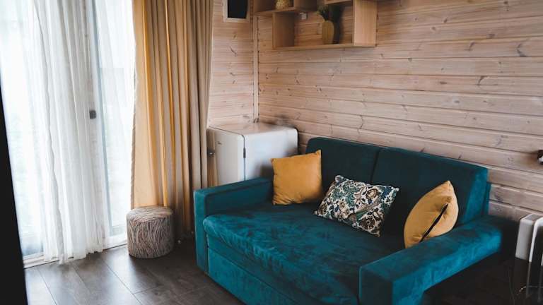 Die Unterkunft verfügt über ein Schlafzimmer, ein Wohnzimmer und eine Küchenzeile, die mit einem Kühlschrank und einer Herdplatte ausgestattet ist.