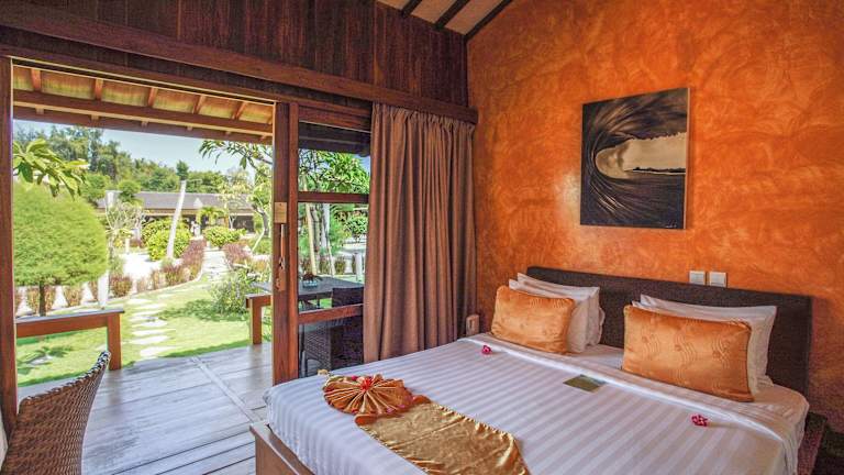Die Zimmer im Pearl of Trawangan sind im Landhausstil gestaltet und bieten eine tropische Atmosphäre. Sie sind mit modernen Annehmlichkeiten wie Klimaanlage, Flachbild-TV, DVD-Player, Wasserkocher und Kühlschrank ausgestattet. Das halboffene Badezimmer verfügt über eine Dusche und kostenlose Pflegeprodukte. Einige Zimmer bieten auch Pool- und Strandblick.