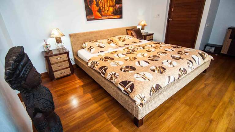 Die Villa umfasst 2 Schlafzimmer, ein Wohnzimmer und eine voll ausgestattete Küche mit Kühlschrank und Kaffeemaschine. Des Weiteren stehen 2 Badezimmer mit Dusche und Badewanne zur Verfügung. Handtücher und Bettwäsche sind ebenfalls vorhanden.