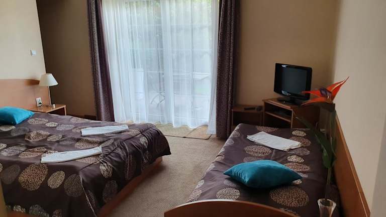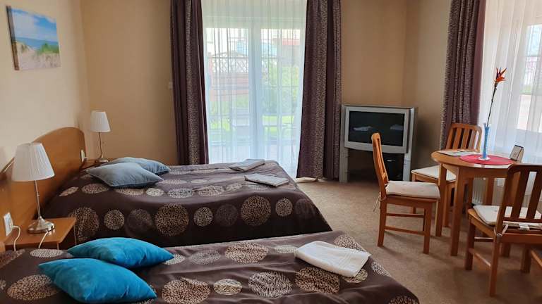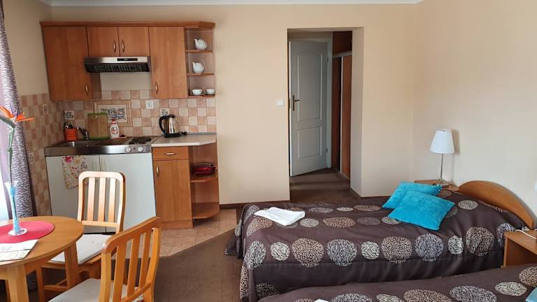 Die Zimmer im Amberek Dom Gościnny sind hell und bieten eine Küchenzeile, in der Sie einfache Mahlzeiten zubereiten können. Jedes Zimmer verfügt über einen TV mit Kabelkanälen und ein eigenes Badezimmer mit Dusche. Zusätzlich zu den grundlegenden Annehmlichkeiten bietet jedes Zimmer einen Sonnenschirm und Liegestühle sowie eine Terrasse oder einen Balkon, um die frische Luft zu genießen.