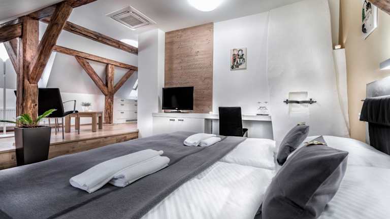 Die Zimmer in der Pension Athanor sind elegant eingerichtet und bieten historische Elemente wie Reproduktionen von Egon Schiele-Kunstwerken. Sie sind mit modernen Annehmlichkeiten wie kostenfreiem WLAN, einem Flachbild-TV und einem Sitzbereich ausgestattet. Einige Zimmer verfügen über Klimaanlage, Whirlpool-Badewanne und Sauna, während andere mit Gewölbedecken und Fresken aus der Renaissance beeindrucken.