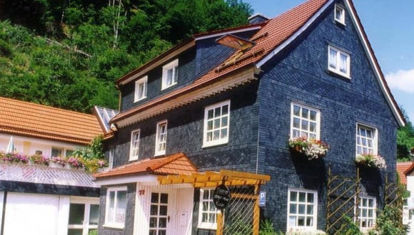 1910 erbautes Wohnhaus mit Schieferfassade und Ziegeldach. Es befindet sich in Familienbesitz und seit 1960 wurden Zimmer vermietet. Mit der deutschen Einigung wurde das Haus 1993 komplett saniert und zur Pension umgebaut. Seit 1995 wurde die kleine Familienpension eröffnet und durch die Besitzer geführt. Um unseren Gästen einen angenehmen Aufenthalt zu bieten, renovieren wir in regelmäßigen Abständen.
