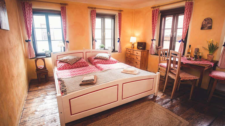 Die Pension Cert a Kaca befindet sich in einem Renaissancegebäude, das einst Teil der Stadtmauer von Böhmisch Krumau war. Die Lage ist ideal, da Sie nur 100 Meter vom Altstadtplatz entfernt sind, wo Sie zahlreiche Sehenswürdigkeiten, Restaurants und Geschäfte finden. Die Stadt Český Krumlov selbst ist ein UNESCO-Weltkulturerbe und bekannt für ihre gut erhaltene mittelalterliche Architektur und ihren malerischen Charme.