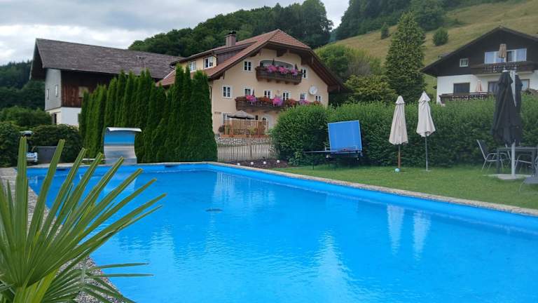 Der Dirnbergerhof bietet Ihnen verschiedene Möglichkeiten, Ihre Freizeit zu gestalten. Im Sommer können Sie den Außenpool und den großen Garten mit Liegestühlen nutzen, um sich zu entspannen und die Sonne zu genießen. Die Umgebung bietet auch zahlreiche Aktivitäten im Freien, wie zum Beispiel Langlaufloipen, die nur 1,5 km entfernt sind. Für Golfliebhaber gibt es den 18-Loch-Golfclub am Mondsee, der nur 5 km entfernt ist, und den 9-Loch-Golfclub Drachenwand, der 4 km entfernt liegt. Die umliegenden Skigebiete Gaissau-Hintersee, Postalm und St. Wolfgang erreichen Sie mit dem Auto in nur 45 Minuten.