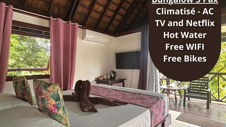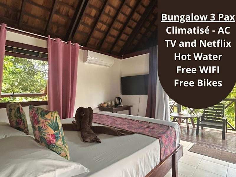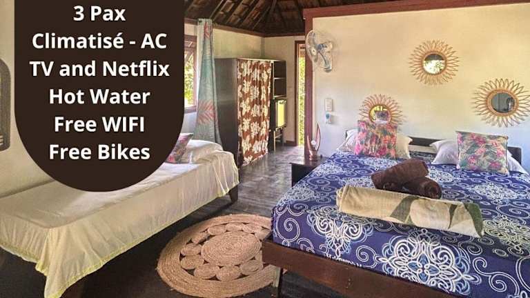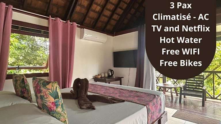 Die Zimmer der Pension Hibiscus Taha'a sind mit Klimaanlage, einem Schreibtisch, einem Flachbild-TV sowie einem eigenen Badezimmer ausgestattet. Jedes Zimmer verfügt über Bettwäsche, Handtücher und eine Terrasse mit Blick auf den Garten. Außerdem sind die Wohneinheiten mit einem Kühlschrank ausgestattet.
