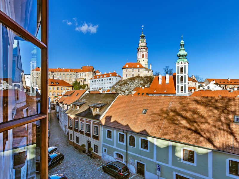 Die Zimmer in der Pension Nostalgie sind mit antiken Möbeln und historischen Stadtplänen ausgestattet. Sie bieten einen gemütlichen Rückzugsort mit modernen Annehmlichkeiten wie eigenem Bad und Flachbild-Sat-TV. Der Blick aus den Fenstern auf das Schloss Český Krumlov ist ein Highlight für Gäste.