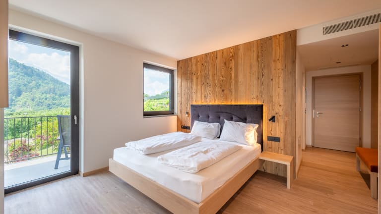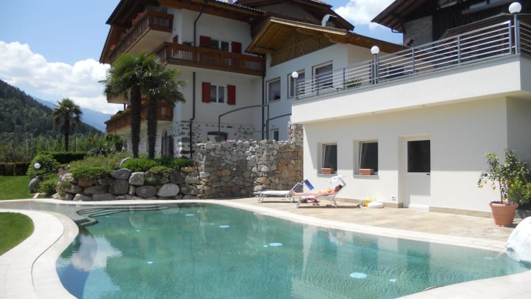 Unsere sonnige und ruhige Lage am Beginn des Algunder und Marlinger Waalweges, die prächtige Aussicht auf die Talweite der Kurstadt Meran und die entspannte Atmosphäre des gemütlichen Familienbetriebes mit einem liebevoll zubereiteten Frühstücksbuffet bieten Ihnen die besten Voraussetzungen für einen entspannten und erlebnisreichen Urlaub. Nach der Wanderung können Sie sich in unserem neuen Indoor Hot Whirlpool oder im beheiztem Freibad mit hautfreundlichem Salzwasser und Panoramablick entspannen. Unsere geräumigen Zimmer sind renoviert und stilvoll ausgestattet. Oder verbringen Sei Ihren Urlaub lieber in unseren neu erbauten Ferienwohnungen in unserem "alten Stadel". Es ist eine Verbindung aus „Alt und Neu“, denn den Typus des Stadels soll man noch spüren. Die Linien des Hauses sind einfach und klar, und unsere neuen und gemütlichen Wohnungen bieten genügend Platz, zum Entspannen und Genießen! Die Wohnungen haben einen umwerfenden Blick auf die Kurstadt Meran, ein modernes Bad, eine voll eingerichtete Küche mit Spülmaschine, sowie Bodenheizung und Klimaanlage. Ihr Urlaubstag beginnt mir einem leckeren Frühstücksbuffet mit einheimischen Produkten, Südtiroler Speck und Käse, Schinken und verschiedenen Wurstsorten und Aufstriche, Müsli aus dem Vinschgau und Meraner Jogurt, dunkle und helle Brotsorten und ein frisch zubereiteter Obstsalat fehlen nie. Die verschiedenen Eierspeisen werden persönlich serviert. Wohnen Sie in der Ferienwohnung, dann können Sie das Frühstück dazu buchen. Für Ihr Bike haben wir einen sicheren Radraum und wir verfügen auch über eine Elektrotankstelle für Ihr Elektroauto. Unser ebener und zum Teil Kiwiüberdachter Parkplatz bietet genügend Platz für jedes Auto. Mit dem Südtirol GuestPass Algund können Sie kostenfrei Bus und Zug fahren, in 80 Museen gehen und mit 6 Seilbahnen fahren. Die Bushaltestelle befindet sich vor dem Haus und der Bus bringt Sie nach Algund und Meran, sowie nach Partschins und in den Naturpark Texelgruppe. In unserem Naturpark finden Sie Wanderungen mit einem einfacheren und schwierigeren Leistungsgrad vor. Der Meraner Höhenweg, der untere Felsenweg und die Wanderung zu den Spronser Seen sind unvergesslich! Nach der Wanderung erwartet sich unser Außenpool oder unser Indoor Hot Whirlpool um die Muskeln zu entspannen. Kalte Getränke und kleine Imbisse sind im Haus erhältlich.