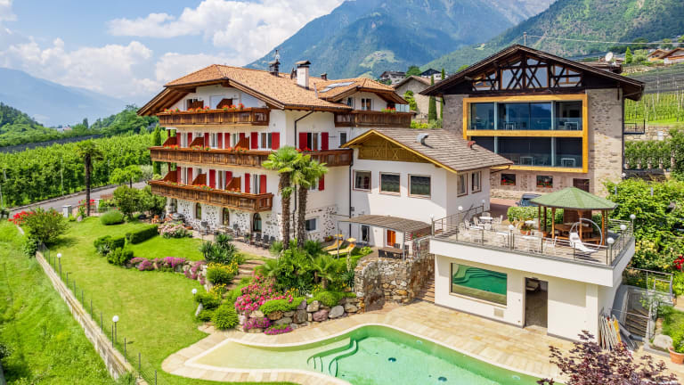 Frühstückspension mit stilvollen Zimmern und modernen Ferienwohnungen mit einem herrlichen Blick auf die Kurstadt Meran, umgeben von einem mediterranen Garten mit Außenpool und Indoor Hot Whirlpool. Ideale Lage zum Wandern und Radfahren, am Algunder Waalweg und nahe am Marlinger Waalweg und am Radweg. Inklusive Südtirol GuestPass Algund und Sie fahren kostenfrei Bus und Zug, 80 Museen und 6 Seilbahnen sind inklusive.