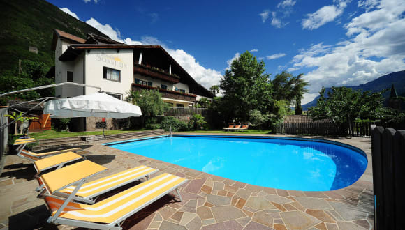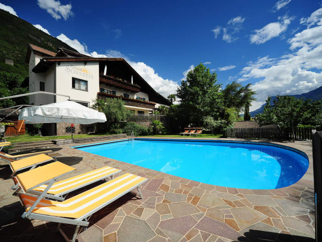 Die Pension Sonnheim befindet sich im verträumten Obstbauerndorf auf der Sonnenseite des Etschtales. Im Winter 2017 wurde ein Großteil der Zimmer renoviert, sodass die Pension Sonnheim mit 3 Sternen ausgezeichnet wurde. Ein schönes Salzwasser-Schwimmbad mit Liegewiese im mediterranen Garten ist ein besonderes Highlight (saisonal). Den Gästen wir ein leckeres Frühstücksbuffet geboten, lokale Produkte, hausgemachte Marmelade - eine Selbstverständlichkeit! Dank der hohen Qualität der angebotenen Dienstleistungen wurde diesem Haus im Jahr 2014 das HolidayCheck Quality Prüfsiegel verliehen. Das Hotel befindet sich ungefähr 10 Gehminuten vom Naturbad Gargazon entfernt. Das Südtiroler Obstbaumuseum, der Hochaltar von Franz Schnatterpeck, die St. Margareth Kirche sowie das Schloss Katzenzungen sind vom Haus nicht weit gelegen. Bozen und Meran sind bequem mit den öffentlichen Verkehrsmitteln zu erreichen!