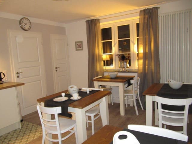 In unserem gemütlichen Frühstücksraum können Sie unser reichhaltiges Frühstück genießen. als Service bieten wir Ihnen eine Flasche Mineralwasser auf dem Zimmer. Restaurants finden Sie im Ort und in der näheren Umgebung.