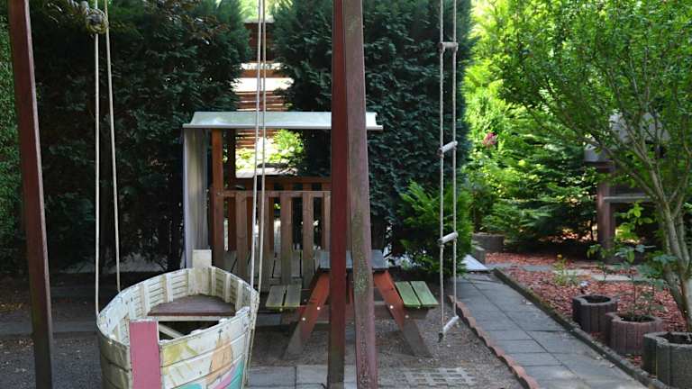 Neben den komfortablen Zimmern bietet die Pension zur Neiße auch einen Kinderspielplatz, der für Unterhaltung für die kleinen Gäste sorgt.