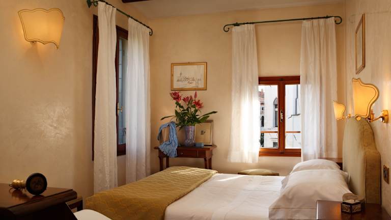 Die Zimmer in der Hotel Pensione Accademia - Villa Maravege sind gemütlich und komfortabel eingerichtet. Jedes Zimmer verfügt über eine Klimaanlage, Sat-TV und eine Minibar. Ein Wasserkocher mit Tee- und Kaffeezubehör steht ebenfalls zur Verfügung. Die Zimmer haben ein eigenes Bad und eine USB-Buchse. Einige Zimmer bieten einen Blick auf den Kanal, während andere einen Blick auf den eigenen Garten haben. Das antike Dekor und das klassische Holzmobiliar verleihen den Zimmern einen besonderen Charme.