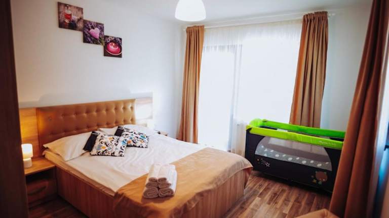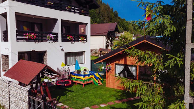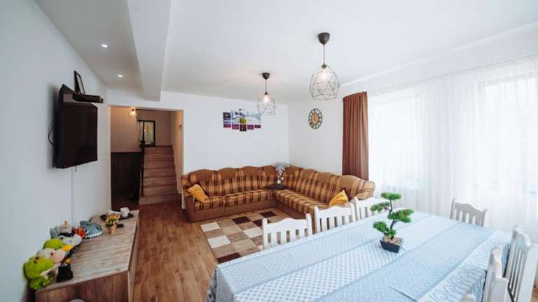 Die Unterkunft Pensiunea „Casa De Acasa“ bietet einen Balkon mit Gartenblick und erstreckt sich über ein Ferienhaus mit 4 Schlafzimmern, einem Wohnzimmer und einer vollständig ausgestatteten Küche. Ein Flachbild-TV ist ebenfalls vorhanden.
