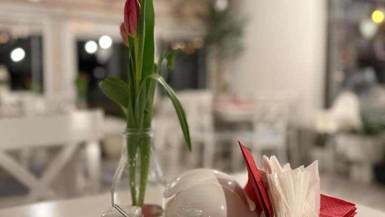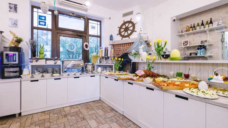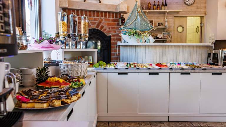 Das Restaurant des Pensjonats serviert ein reichhaltiges Frühstücksbuffet sowie traditionelle Gerichte, insbesondere Fisch, und bietet somit eine Auswahl für jeden Geschmack.