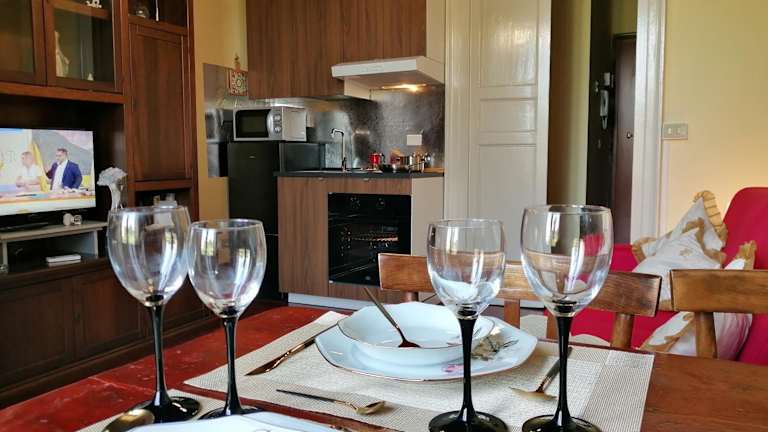 Die Ferienwohnung umfasst 1 Schlafzimmer, ein Wohnzimmer und eine voll ausgestattete Küche mit Kühlschrank und Wasserkocher. Das Badezimmer ist mit einem Bidet und einem Haartrockner ausgestattet. Handtücher und Bettwäsche werden bereitgestellt.