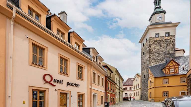 Die Pension Quest ist eine ideale Unterkunft für Reisende, die das charmante Loket erkunden möchten. Das rekonstruierte Haus neben der Burg bietet komfortable Zimmer mit modernen Annehmlichkeiten. Nutzen Sie die Möglichkeit, ein Fahrrad auszuleihen und die Umgebung auf zwei Rädern zu erkunden. Die Nähe zu Sehenswürdigkeiten wie der Burg Loket und der St.-Wenzeslaus-Kirche machen die Pension Quest zu einem ausgezeichneten Ausgangspunkt für Ihre Entdeckungstour.
