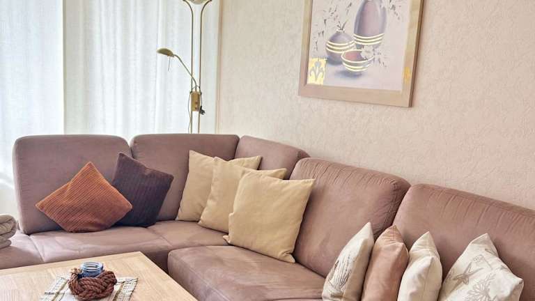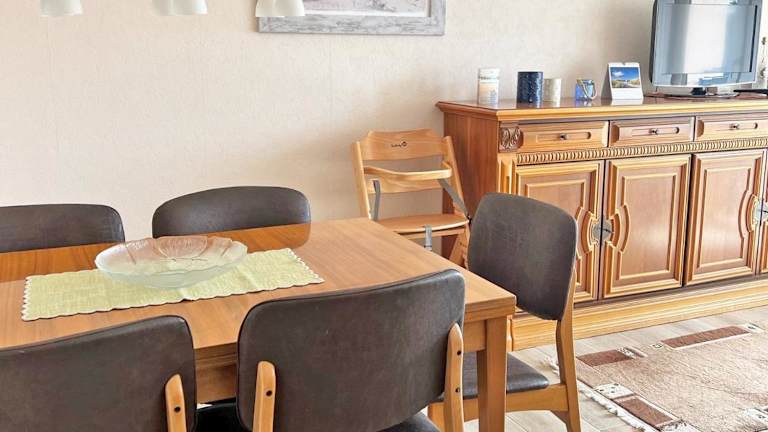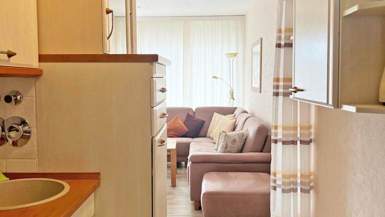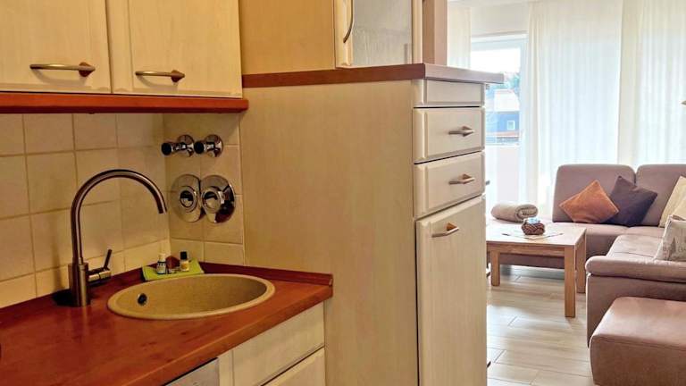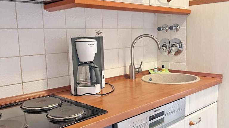 Die Ferienwohnung ist mit einer Küchenzeile ausgestattet, die einen Kühlschrank, Geschirrspüler, Ofen, Kaffeemaschine und Wasserkocher umfasst, wodurch Selbstverpflegung möglich ist.
