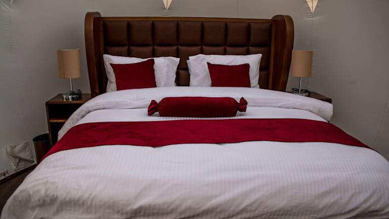 Die Zelt-Lodge bietet eine Terrasse, auf der die Gäste das schöne Wetter genießen können.
