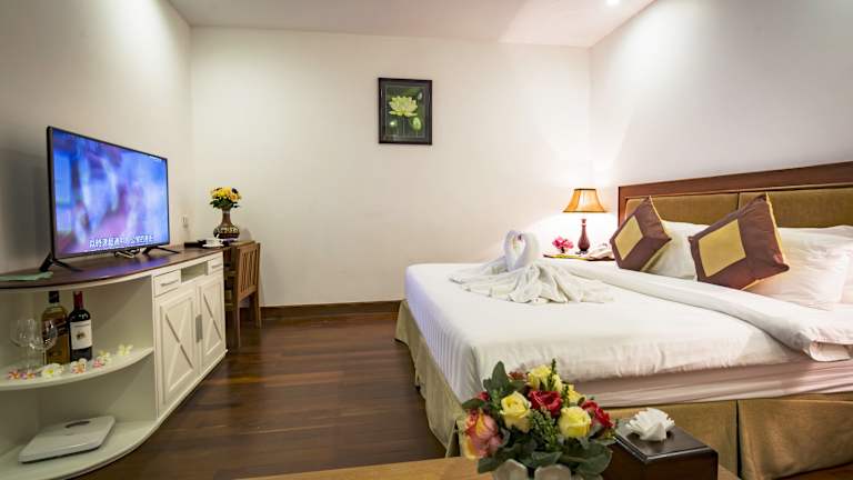 Die klimatisierten Zimmer und Suiten im Phnom Penh Katari Hotel sind gut ausgestattet und bieten den Gästen Annehmlichkeiten wie einen Flachbild-TV, einen Safe und eine Minibar. Die Badezimmer sind mit einer Badewanne oder Dusche, einem Haartrockner, Bademänteln und Hausschuhen ausgestattet. Das Hotel bietet auch einen Fitnessbereich und einen Massagesalon für die Gäste, die sich entspannen und fit bleiben möchten.