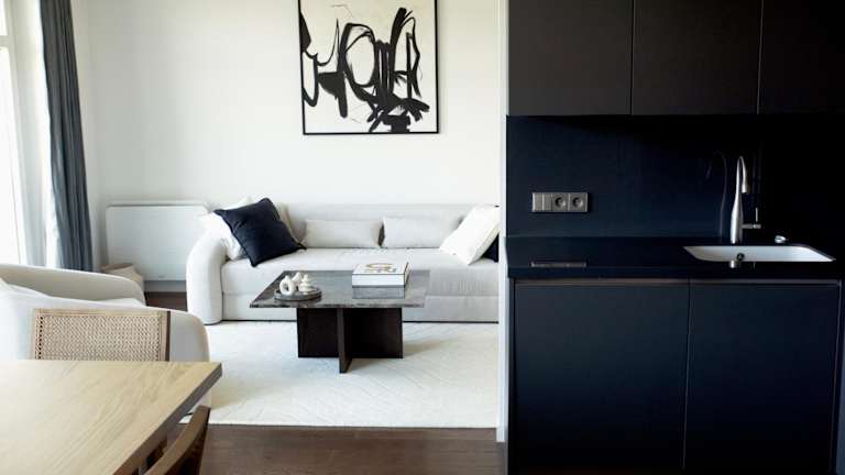 Die Apartments verfügen über eine voll ausgestattete Küche mit einem Essbereich, einem Kühlschrank, Geschirrspüler, Mikrowelle, Kaffeemaschine und Wasserkocher.
