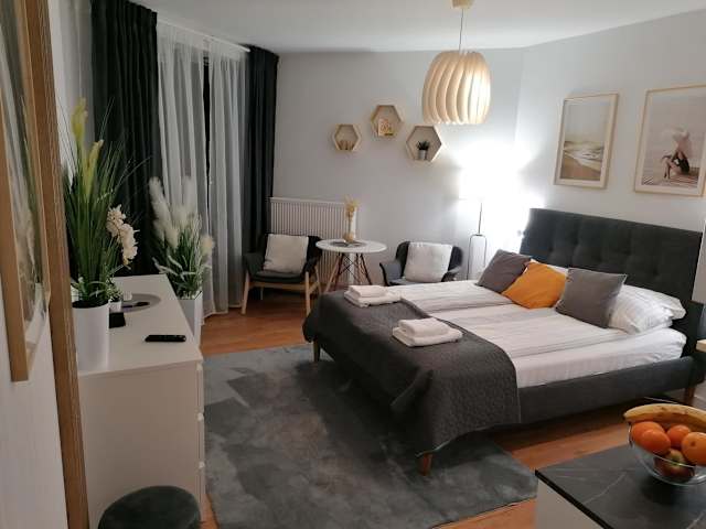 Die Ferienwohnung besteht aus einem Schlafzimmer, einem Badezimmer und einer voll ausgestatteten Küchenzeile. Zur Ausstattung gehören zudem Bettwäsche, Handtücher, ein Flachbild-TV mit Satellitenkanälen sowie eine Terrasse mit Meerblick. Ein Privatparkplatz ist vorhanden.