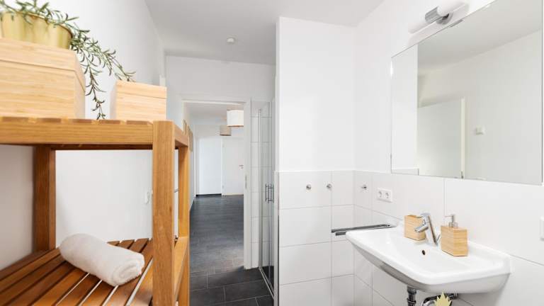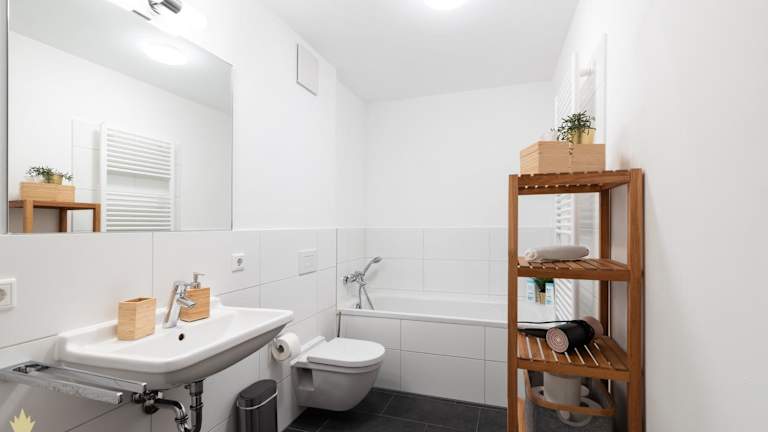 Die Ferienwohnung besteht aus zwei Schlafzimmern, einem Wohnzimmer und einer voll ausgestatteten Küche, die mit einem Kühlschrank und einer Kaffeemaschine ausgestattet ist. Zusätzlich gibt es ein Badezimmer mit Dusche und Haartrockner. Handtücher und Bettwäsche werden bereitgestellt.