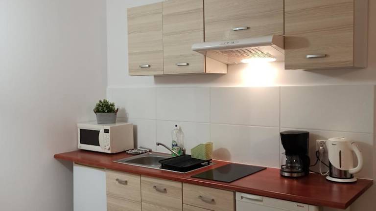 Die Unterkunft verfügt über eine voll ausgestattete Küchenzeile, die einen Kühlschrank und eine Kaffeemaschine beinhaltet. Ein Flachbild-TV sowie ein eigenes Badezimmer mit Dusche sind ebenfalls vorhanden.