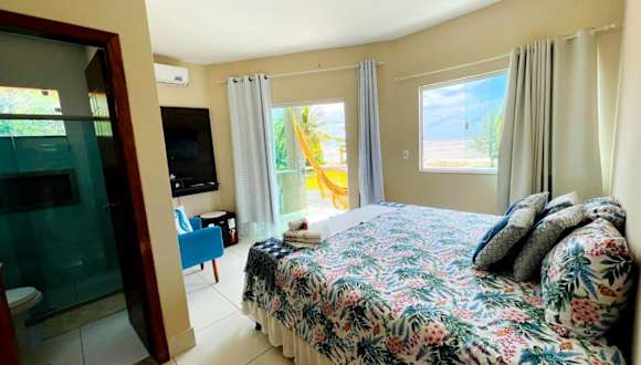 Das O Paraíso é aqui Abrolhos in Caravelas, Bahia, bietet Ihnen eine komfortable Privatunterkunft mit einer Terrasse und Meerblick. Genießen Sie die Ruhe und den Komfort dieser Unterkunft, die über kostenfreies WLAN, einen Flachbild-Kabel-TV und eine voll ausgestattete Küche verfügt. Morgens erwartet Sie ein köstliches À-la-carte-Frühstück. Die Unterkunft bietet zudem einen Garten und kostenfreie Privatparkplätze. Nutzen Sie die Gelegenheit, die Umgebung zu erkunden und besuchen Sie die nahegelegenen Städte Alcobaça und Teixeira de Freitas.