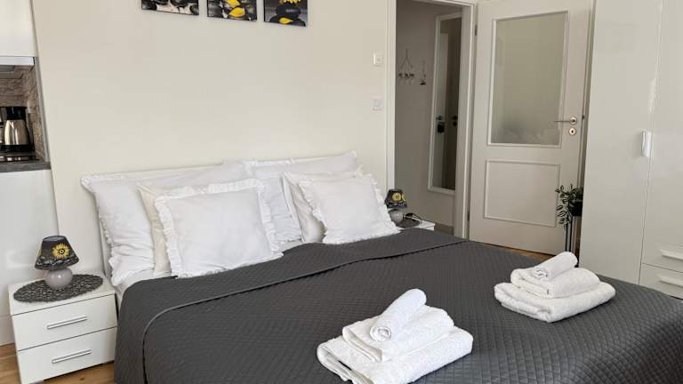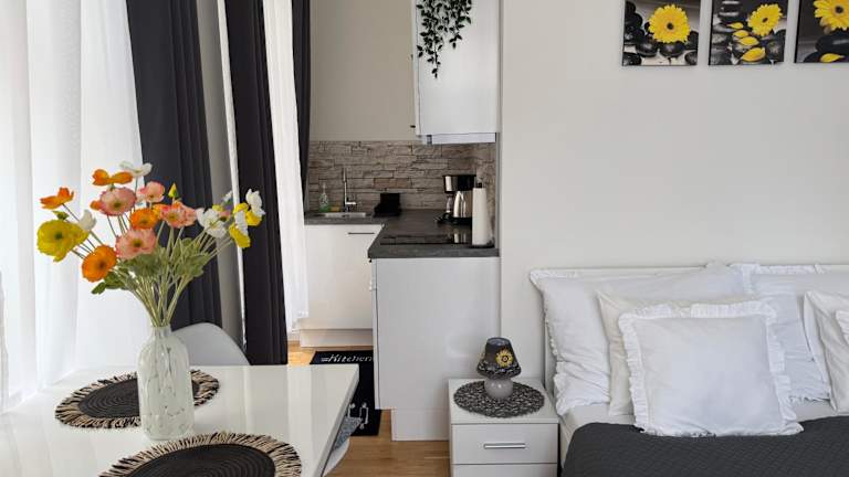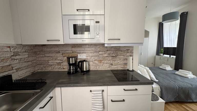 Die Ferienwohnung verfügt über ein Schlafzimmer, eine Küche mit Kühlschrank und Mikrowelle sowie ein Badezimmer mit Dusche und kostenlosen Pflegeprodukten. Handtücher und Bettwäsche werden bereitgestellt, und es gibt zusätzlich eine Waschmaschine für den Komfort der Gäste.