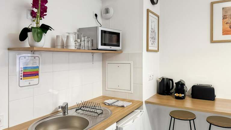 Das Studio umfasst 1 Schlafzimmer und ein Wohnzimmer, ausgestattet mit einer voll ausgestatteten Küche, die einen Kühlschrank und eine Kaffeemaschine beinhaltet. Das Badezimmer verfügt über eine Dusche und kostenlose Pflegeprodukte. Handtücher und Bettwäsche werden bereitgestellt. Die Unterkunft ist eine Nichtraucherunterkunft.