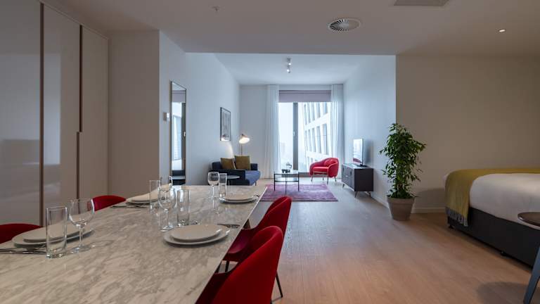 Die Apartments sind mit einer voll ausgestatteten Küche, einem Geschirrspüler, einem Sitzbereich mit Sofa, einem Flachbild-TV und einer Waschmaschine mit Trocknerfunktion ausgestattet. Jedes Apartment verfügt über ein eigenes Bad mit Dusche und Haartrockner. Weitere Annehmlichkeiten umfassen Mikrowelle, Kühlschrank, Backofen, Wasserkocher und Kaffeemaschine.