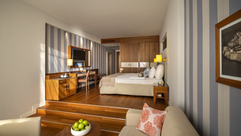 Luxuriöser Aufenthalt mit herrlicher Aussicht Für einen traumhaften Luxusurlaub nahe dem historischen Zentrum von Dubrovnik ist das President Hotel, Valamar Collection, genau das Richtige. Es liegt günstig in der Nähe der geschichtsträchtigen Altstadt. Majestätisch an der Spitze der üppig grünen Halbinsel Babin Kuk gelegen, bietet dieses Fünf-Sterne-Hotel elegante Unterkünfte mit atemberaubendem Blick auf die Adria. Wählen Sie aus einer Auswahl exquisiter Zimmer und Suiten mit Meerblick und genießen Sie den traumhaften Strand direkt unter dem Hotel, das schöne Spa, die eleganten Pools und die traumhaften Terrassen mit goldenen Sonnenuntergängen. Genießen Sie das preisgekrönte Frühstücksbuffet und die gehobene Küche im Restaurant La Mar. Tauchen Sie ein in die zeitlose Romantik und Schönheit der UNESCO-geschützten Altstadt von Dubrovnik, nur eine kurze Fahrt entfernt. - Perfekte Lage am Strand - Meerblick von allen öffentlichen Bereichen - Außen- und Innenpool - Wellness - Zentrum - Exklusives Restaurant Miramare - NEU IN 2023: Maro World – das größte Familien-Unterhaltungszentrum an der Adria mit zahlreichen Edutainment-Attraktionen für Kinder jeden Alters auf einer Fläche von 1800 m2 - Kostenloser Ladeservice für Elektrofahrzeuge - Valamar Experience Concierge (Guest Relations) - Ihr persönlicher Berater für Auswahl und Planung der besten Erlebnisse - V LEVEL: Wählen Sie die Premium-Zimmer mit V Level Luxus-Serviceleistungen - Die Touristenklinik in der Destination ist während der regulären Arbeitszeit und der diensthabende Arzt für telefonische Beratungen rund um die Uhr erreichbar