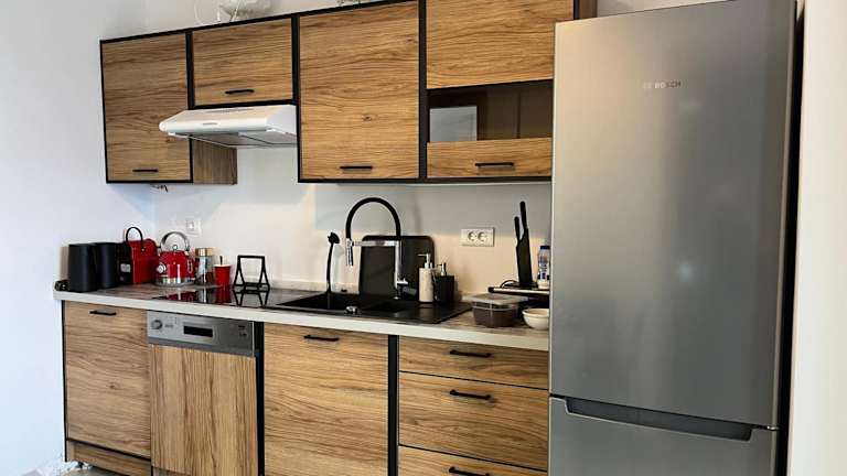 Die Unterkunft ist mit einer Küche ausgestattet, die über einen Kühlschrank, einen Geschirrspüler und einen Ofen verfügt.