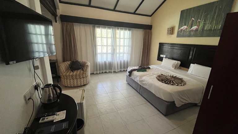 An einen zum Strand sanft abfallenden Hügel gebaut,besteht das Hotel aus einem Hauptgebäude im Kolonialstil mit grosser Empfangshalle, Rezeption, Restaurants, Boutiquen, Vernissage- und Ausstellungsraum. Neben dem Hauptgebäude befinden sich die in weiss und rosa gehaltenen Wohnflügel, die reich verziert mit handgearbeitetem Tropenholz ihre persönliche Note besitzen. Absoluter Blickfang ist jedoch der 2400 m2 grosse Pool mit Palmeninsel und rauschendem Wassefall.