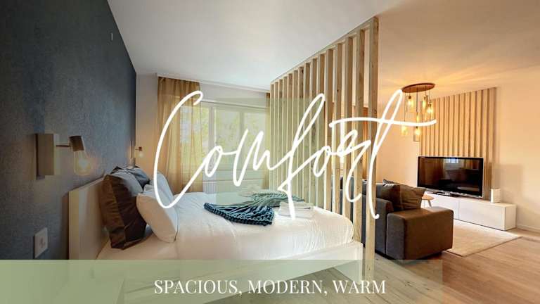 Die Ferienwohnung verfügt über 43m2 Wohnfläche, 1 Schlafzimmer, ein Wohnzimmer, einen Fernseher sowie eine gut ausgestattete Küche mit Kühlschrank und Geschirrspüler. Das Badezimmer ist mit einer Badewanne ausgestattet. Zur weiteren Ausstattung gehören Handtücher und Bettwäsche sowie eine Terrasse mit Stadtblick.