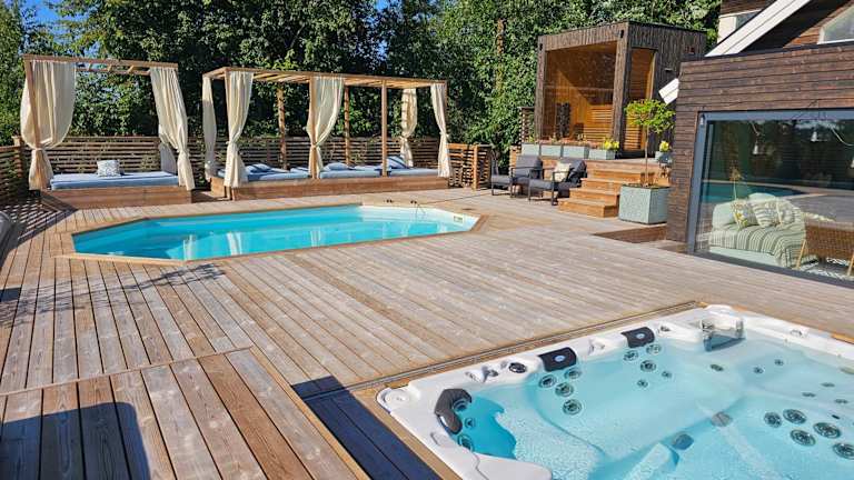 Die Privat Spirit Spa Villa bietet eine moderne Unterkunft mit einer Terrasse, die einen herrlichen Blick auf den Pool sowie den See ermöglicht. Zur Ausstattung gehört ein ganzjährig geöffneter Außenpool, eine Sauna und ein Whirlpool. Die Villa wird von einem privaten Gastgeber betrieben und richtet sich an erwachsene Gäste, die eine ruhige Umgebung suchen.