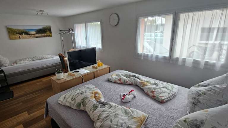 Die Ferienwohnung umfasst ein Schlafzimmer und ein Badezimmer mit Badewanne oder Dusche. Zur Ausstattung gehören ein Flachbild-TV mit Kabelkanälen sowie Handtücher und Bettwäsche.