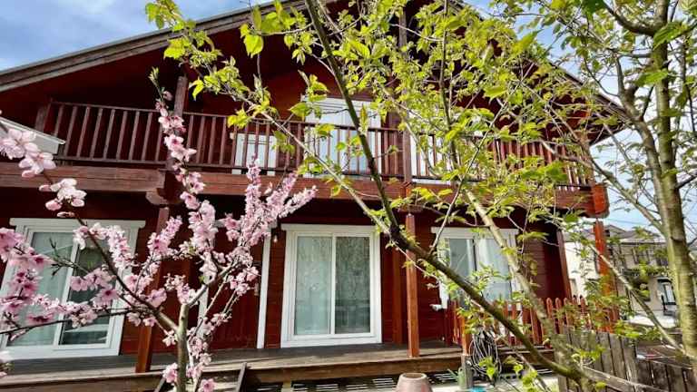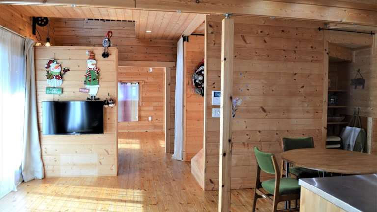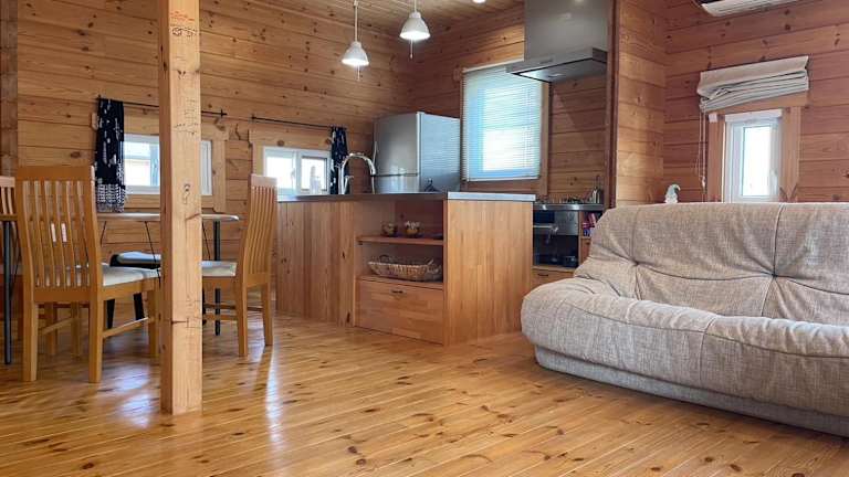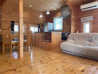 Private house LOG HOUSE 瀬戸市品野町 #AB1 bietet eine Ferienwohnung mit einer hochwertigen Ausstattung. Die Unterkunft umfasst zwei Schlafzimmer und einen Balkon, der Zugang zur Terrasse ermöglicht.