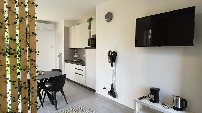 Die Ferienwohnung umfasst 1 Schlafzimmer und ein Wohnzimmer. Die voll ausgestattete Küche ist mit einem Kühlschrank und einer Kaffeemaschine ausgestattet. Die Unterkunft verfügt zudem über ein Badezimmer mit Bidet und Dusche. Handtücher und Bettwäsche werden bereitgestellt. Die Wohnung ist klimatisiert.