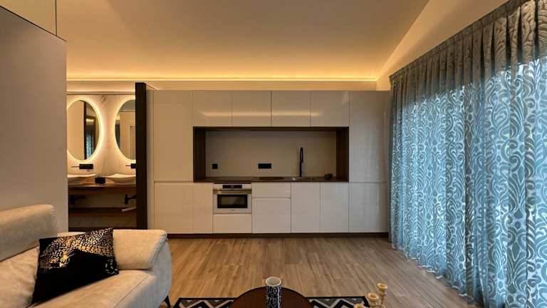 Die Unterkunft verfügt über ein Schlafzimmer und ein Badezimmer. Zur Ausstattung gehören Bettwäsche und Handtücher, ein Flachbild-TV, ein Essbereich sowie eine voll ausgestattete Küche. Eine Terrasse mit Blick auf die Berge ist ebenfalls vorhanden.