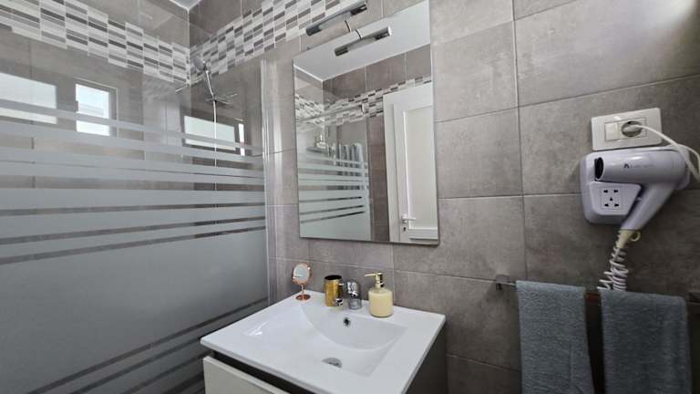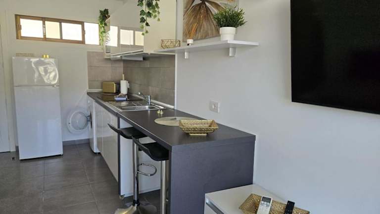 Die Ferienwohnung besteht aus einem Schlafzimmer, einem Wohnzimmer, einer voll ausgestatteten Küche mit Kühlschrank und Wasserkocher sowie einem Badezimmer mit Dusche und Haartrockner. Handtücher und Bettwäsche werden zur Verfügung gestellt. Die Unterkunft bietet verschiedene Annehmlichkeiten wie Klimaanlage, Nichtraucherzimmer und Terrasse.