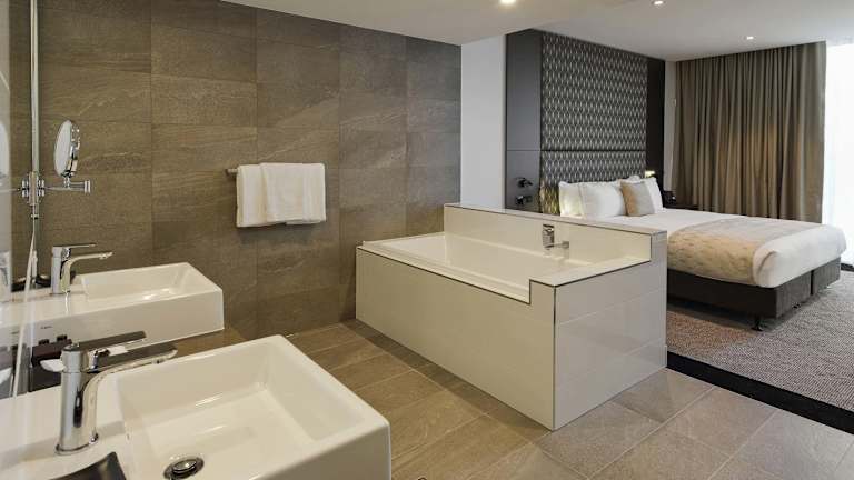 Die klimatisierten Zimmer sind mit modernen Annehmlichkeiten ausgestattet, darunter Flachbild-TV, eine Kaffeemaschine und ein Wasserkocher. Die Badezimmer verfügen über eine Dusche und Badewanne, und es stehen kostenfreie Pflegeprodukte sowie Bademäntel zur Verfügung. Zusätzlich gibt es rollstuhlgerechte Zimmer mit barrierefreiem Bad. Zu den Zimmerausstattungen gehören Hausschuhe, ein Schreibtisch, ein Safe, eine Minibar und WLAN-Zugang.