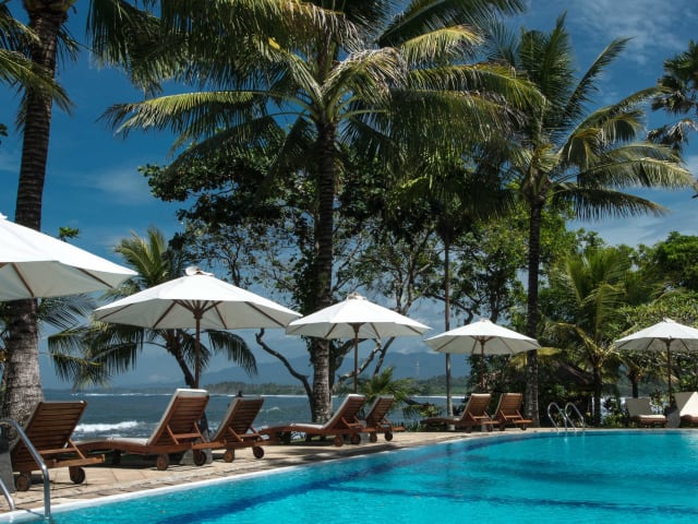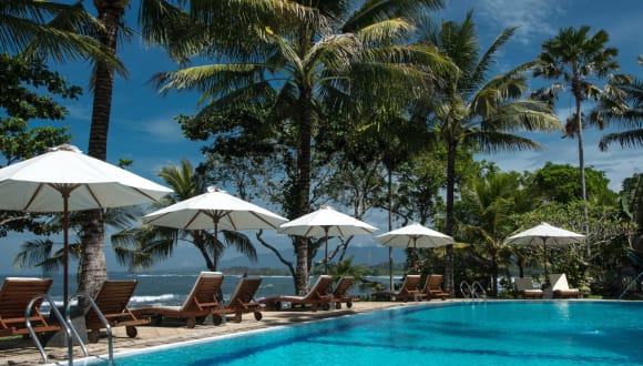 A large 20 x 10 m overflowing swimming pool fed directly by pure, crystal-clear water drawn from a 40-meter well awaits you after your excursions. Located a few meters from the beach, restaurant and the wellness center, you can alternate all kinds of pleasures. For the kids, a 50-cm deep wading pool will be their favorite playground. Should you feel more inclined to get some rest, 3 traditional Balinese \"gazebos\" are at your disposal for unique siestas or massages. A sunken bar will offer you a selection of the region\'s most exotic cocktails. Puri Dajuma Cottages is located on a cape surrounded by two sandy beaches directly accessible from your cottage. If you like swimming in a safe and natural environment, you will be delighted by the softness and cleanliness of the sea. If you prefer strolling along the beach you will be astonished by the number of smiling people you will meet: fishermen from the neighboring village, rice farmers with their oxen, lobster hunters able to dive as deep as 20 meters while simply holding their breath... At low tide, the cape is accessible over a distance of 200 meters and becomes a real paradise for fishermen and children who want to discover the marvelous underwater life. At only five minutes from our hotel by boat or by car, surf amateurs will discover the famous Medewi surf location which surfing champions from all over the world regularly make their playground.