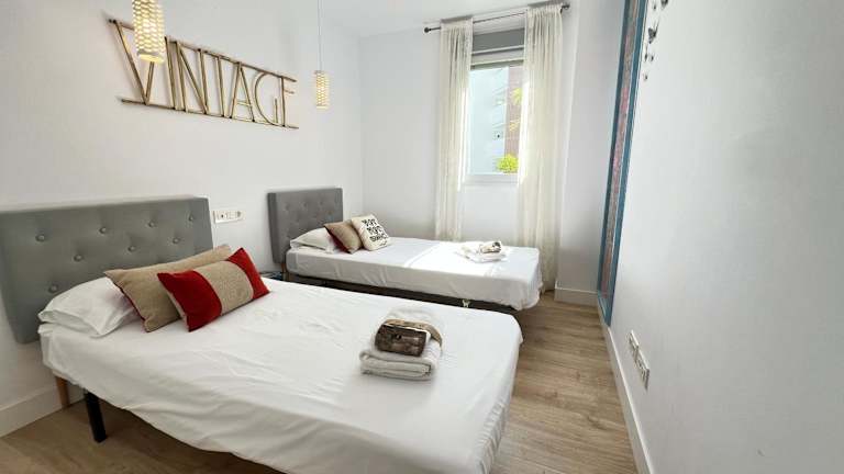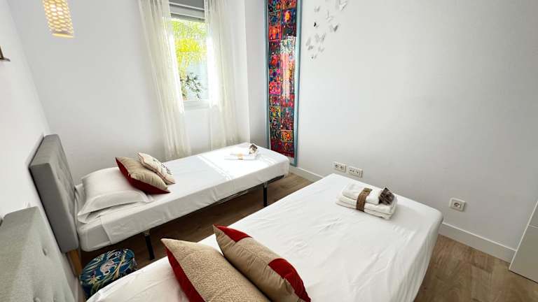 Die Ferienwohnung besteht aus zwei Schlafzimmern und einem Wohnzimmer. Zur Ausstattung gehören eine voll ausgestattete Küche mit Kühlschrank und Kaffeemaschine, sowie zwei Badezimmer mit Bidet und Dusche. Handtücher und Bettwäsche werden zur Verfügung gestellt. Zudem sind die Zimmer klimatisiert und schallisoliert.