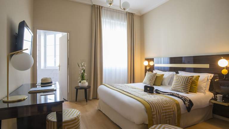 Die Zimmer im Hôtel Carlton sind im klassischen Stil eingerichtet und bieten eine komfortable Ausstattung, einschließlich Klimaanlage, kostenfreiem WLAN, Sat-TV und einer Minibar.