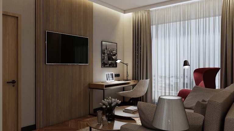Das Hotel bietet insgesamt 136 Zimmer, darunter 82 Einzelzimmer, 50 Doppelzimmer und 4 Apartments. Alle Zimmer sind komfortabel eingerichtet und verfügen über eine Heizung, ein Doppelbett, eine Minibar, ein Telefon mit Direktwahl, einen Fernseher mit Satelliten- und Kabelempfang sowie kostenloses WLAN. Die Badezimmer sind mit einer Dusche und einer Badewanne ausgestattet.